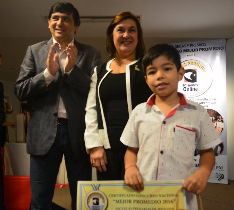 El estudiante Agustín Adriel Díaz, de 8 años, es de la localidad de Garupá, y resultó ganador de la computadora e impresora que fue aportada por el Rotary Club Posadas, en la Categoría Primarias de Misiones, por participar del Concurso Mejor Promedio 2016. El certificado de reconocimiento fue entregado por el intendente de Posadas, Joaquín Losada, junto a la presidente del Rotary, Dorys Mabel Sánchez.