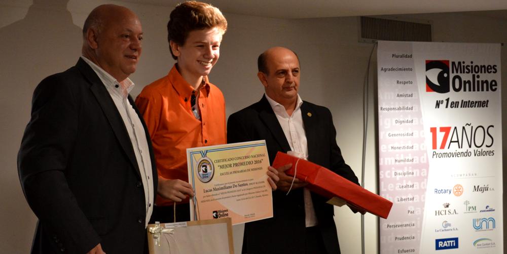 En esta categoría, por empate, y tras el aporte de una notebook del Consejo de Profesionales de Ciencias Económicas de Misiones, también fue premiado el niño posadeño Lucas Maximiliano Do Santo, que cursó el 7mo grado del Instituto Adventista Alta Gracia, en Posadas. En este caso, el certificado fue entregado por el Jefe de Gabinete de Ministros del Gobierno de Misiones, Adolfo Pischik, junto al presidente del Consejo, Miguel Ángel Andujar.
