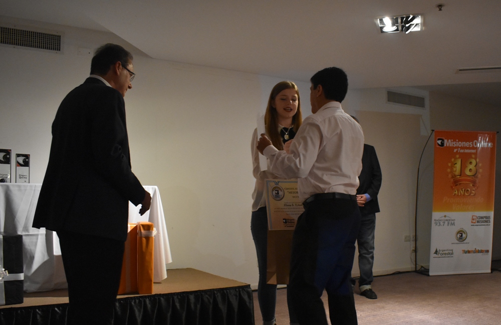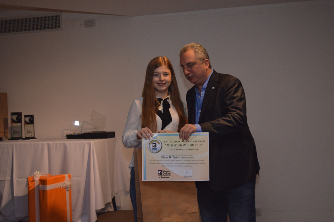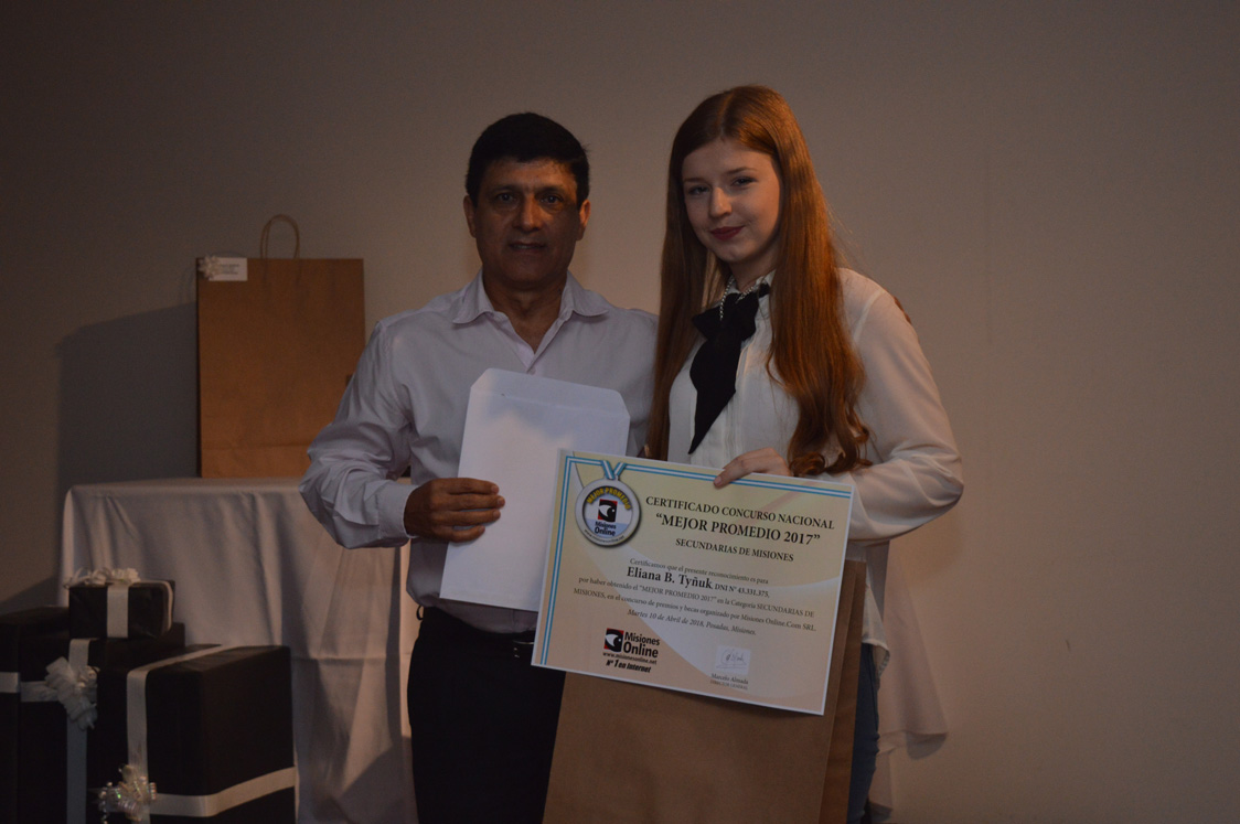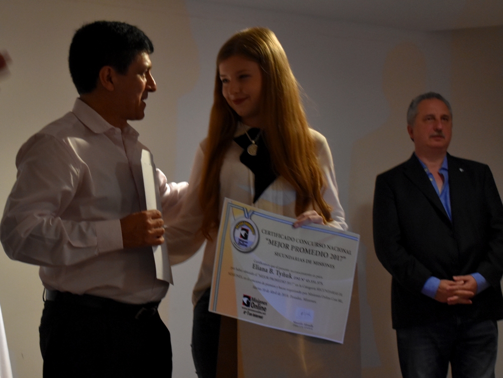 La adolescente recibió en el acto de entrega realizado ayer, en el marco del 18° Aniversario de Misiones Online, el premio del Concurso Mejor Promedio 2017, una beca de la Universidad Nacional de Misiones (UNaM) por 25 mil pesos. La entrega del certificado de reconocimiento a la alumna estuvo a cargo del gobernador de Misiones, Hugo Passalacqua. En tanto, la resolución que acredita desde la UNaM la beca a favor de la estudiante fue entregada por el secretario de Extensión Universitaria, Miguel Ángel López.